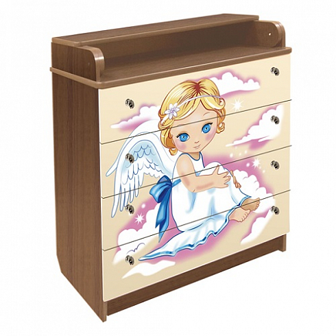 Комод Vlana с трансформируемой крышкой «Ангелы» КМА (КМП) 80/4-12  - пеленальный,  изготовлен из качественной фурнитуры и материалов –ЛДСП и МДФ, что дает пользователю долгий срок службы изделия. Комод снабжен пеленальной поверхностью с бортиками, что предостережет малыша от случайного падения. Снабжен он 4-мя вместительными ящиками,  которые предназначены для одежды, аксессуаров, игрушек ребенка и всего того, что может пригодиться при пеленании малыша. Комод безопасный - без острых углов. Фасады изделия декорированы привлекательными изображениями, которые наносятся при помощи метода УФ-печати. Модель прекрасно впишется в интерьер любой детской комнаты. Ящики с бесшумным и плавным открытием и закрытием, которые оценят родители в процессе использования, ведь тишина это залог крепкого сна ребенка.